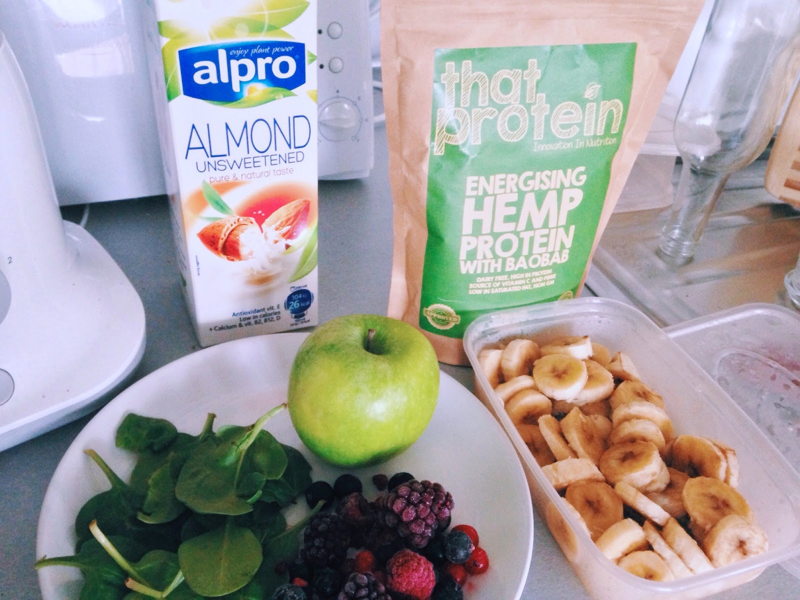 It’s been a little while since I’ve posted a smoothie recipe, but with all the pressure of my final year dissertation coming to a head, I’ve been actively trying to eat well and keep myself fuelled for the gruelling work – which has meant smoothies galore! The recipes I usually whip up in the morning involve peanut butter or berries, but I decided to try out creating a smoothie bowl as a kind of half-way house between breakfast cereal and a drink. For added energy, I’ve been using That Protein’s energising organic hemp protein with baobab powder* – both the ingredients are great superfoods, with so much vitamin c from the baobab, a big protein boost from the hemp. I couldn’t be happier with how full and awake this recipe makes me feel after a good morning yoga session – almost happy enough to face a 5,000 word essay!