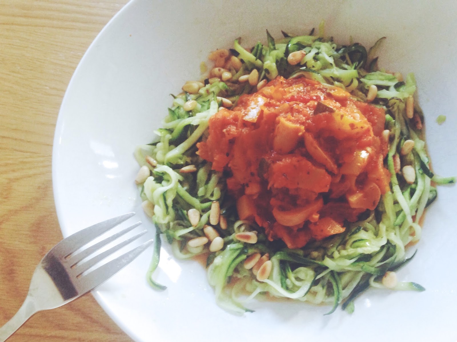 - To make the courgette spaghetti, use a spiraliser (I have a handheld one) or julienne peeler and twirl into long noodles, directly into the now empty frying pan along with a splash of olive oil. I also usually chop up any excess courgette and throw it into the bolognese at this point